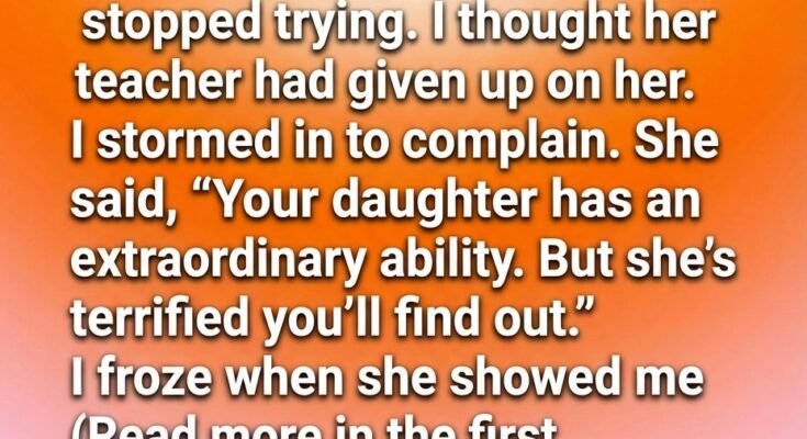When I finally sat across from her teacher, I expected defensiveness. Instead, she looked calm—almost relieved. Before I could finish listing my concerns, she stopped me gently and said, “Your daughter has an extraordinary ability. But she’s terrified you’ll find out.” Her words stunned me. Terrified? Of what? The teacher opened a folder and slid it across the desk. Inside were not test scores, but pages filled with sketches, patterns, stories written in the margins of assignments, and complex problem-solving notes she had done privately after class. “She finishes her work quickly,” the teacher explained, “then hides what she’s really doing. She’s afraid being different will disappoint you.”